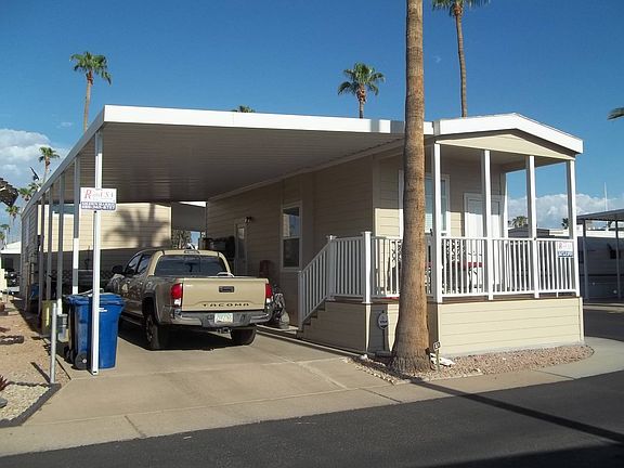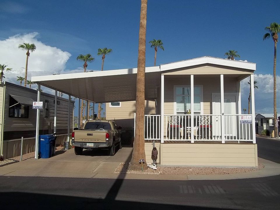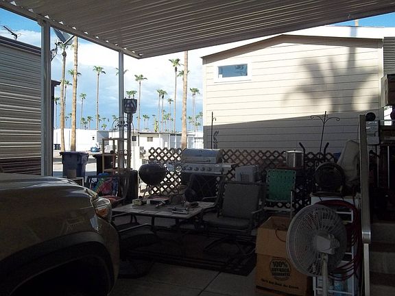 Lot Rent Paid Until April 2027! Corner Lot! Front Patio, Doors with Adjustable Blinds, L-Shaped Kitchen, Granit Counters, Built-in Microwave, Flat Top Stove, Blinds, Ceiling Fans, Tiled Backsplash, Garbage Disposal, Step-in Shower, Stackable W/D, Long Carport, Outdoor Living Area, central A/C & Heat. This almost new Park Model is located in a 55+ Community. Items in Photos May Not Convey.