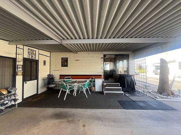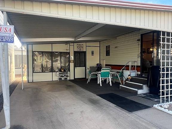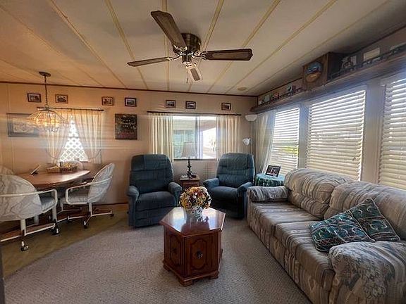 Located in a 55+ Community Full of Amenities, this Park Model is Move-in Ready and Features Wide lot with reinforced carport, Roof recently resealed and reinforced (including Arizona Room), Insulated Arizona Room, 40-gallon water heater, Reverse osmosis system in kitchen, Built-in microwave and porcelain sink, Newer bathroom & kitchen faucets, Large pantry, Two large mirrored closets and built-in dresser, Queen-size bed (room for a king) with built-in overhead storage, Three ceiling fans, Painted Interior, 65-inch flat-screen TV and additional 32-inch flat-screen TV, Black leather reclining sofa, desk, and entertainment center included, Daybed with Trundle. Laundry Area has a Dryer & Heavy-duty washer and plenty of storage throughout. Lot Rent is listed as an estimated monthly breakout that is due annually each year.