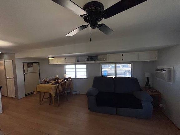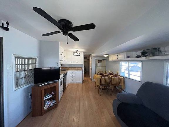 Located in a 55+ Resort Style Resort know for their premier amenities, this home featuring charming pencil cactus in front and back. Privacy screens, and a spacious outdoor living area with room for a car under the epoxy-coated carport. Inside, enjoy textured walls, fresh paint, upgraded lighting fixtures, blinds, and drapes. The living area includes a reclining sofa & chair, flatscreen TV, and ceiling fan. The kitchen offers laminate countertops, a stainless steel sink with upgraded faucet, dishwasher, microwave, refrigerator, and a fan light combo. The bathroom features a tub/shower combo, tiled floor, and ample storage. The bedroom includes a queen bed (fits a king), his-and-hers mirrored closets, built-in desk, extra storage, and a ceiling fan. Additional features include pocket doors, laminate plank wood-like flooring, digital thermostat, floor heaters, large shed with washer and dryer, outdoor power, and a sliding glass door with screen. Some items pictured may not convey. Lot Rent for this resort is due annually. The online cost shown is a monthly estimate.