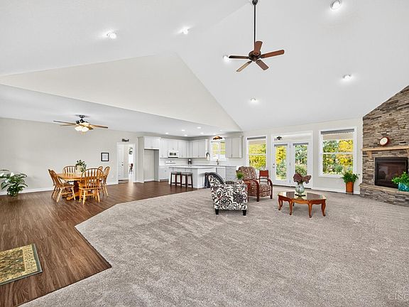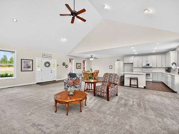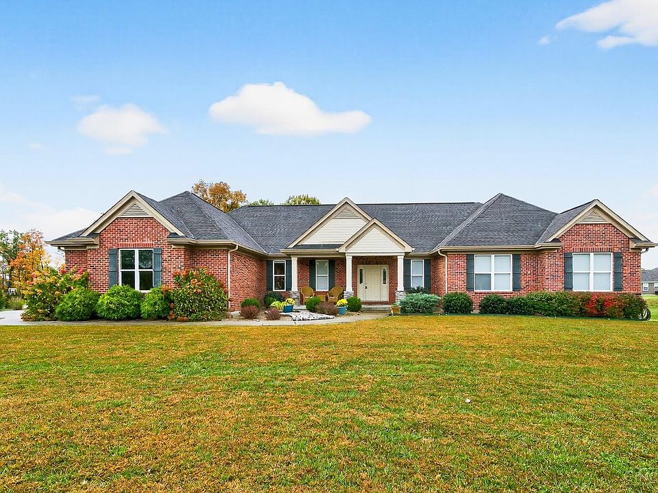 Beautiful Custom Home with 2577 sq ft on a large Flat lot! Potential to finish bsmt for over 5,000 plus sq ft. Stunning great room with vaulted ceilings & stone fireplace. Kitchen is complete with large island, quartz countertops, luxury vinyl plank flooring and a pantry. Gorgeous Primary Suite with adjoining bathroom including double vanity & walk-in soaking Tub. Large Closets for storage. Office has luxury vinyl plank floors and can be transformed into any space, game room, extra bdrm etc. Beautiful Covered Front Porch and Covered Patio perfect for entertaining. 3 Car attached garage with additional detached 1 car/ pole Barn with electric. Built in 2019. AC 2024. Nothing left but to Move In and Enjoy!