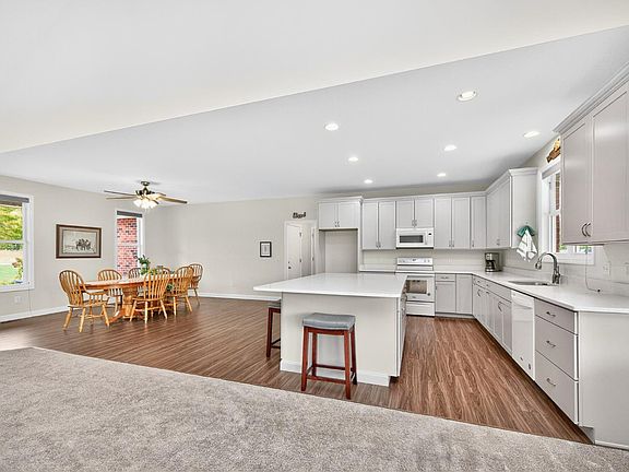 Beautiful Custom Home with 2577 sq ft on a large Flat lot! Stunning great room with vaulted ceilings & stone fireplace.  Kitchen is complete with large island, quartz countertops, luxury vinyl plank flooring and a pantry.  Gorgeous Primary Suite with adjoining bathroom including double vanity & walk-in soaking Tub. Large Closets for storage.  Office has luxury vinyl plank floors and can be transformed into any space, game room, extra bdrm etc. Beautiful Covered Front Porch and Covered Patio perfect for entertaining. 3 Car attached garage with additional detached 1 car/ pole Barn with electric. Built in 2019. AC 2024.  Nothing left but to Move In and Enjoy!