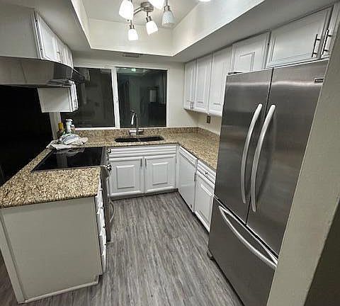 Clean and efficient kitchenPrivate patioIn-suite bathDining areaSpacious primary suiteNewer vinyl wood flooring