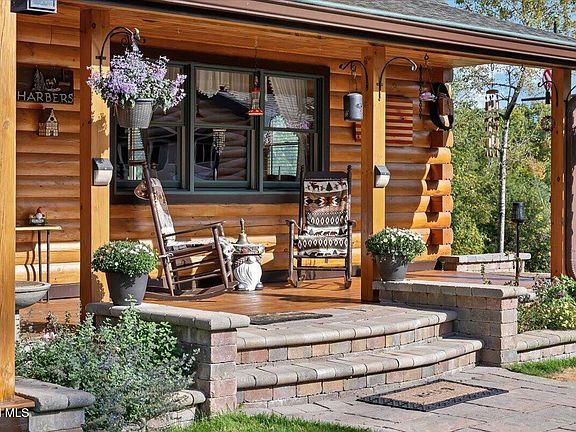 Stone pillarsD-log white pine homeFront covered porchFloor-to-ceiling log wallsGrand paver patioSprawling primary suiteSpa-like bath