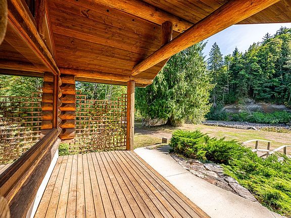 Private waterfrontCraftsman-style log homeVaulted ceilingsFir floorsOpen layoutWood stoveMetal roof