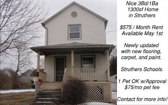 Newly renovated 3bd/1ba 1300sf single family home in Struthers, OH. Available May 1st. W/D hook-ups available in basement. Features two nice living areas on the first floor and large kitchen. Must see! Contact for additional info! Tenant responsible for all utilities and yard maintenance. Security Deposit, First, and Last Month rent due prior to move in. Pets (less 40lbs) OK with approval. $75/mo pet fee applies. Max 1 pet allowed. W/D hook-ups available in basement.