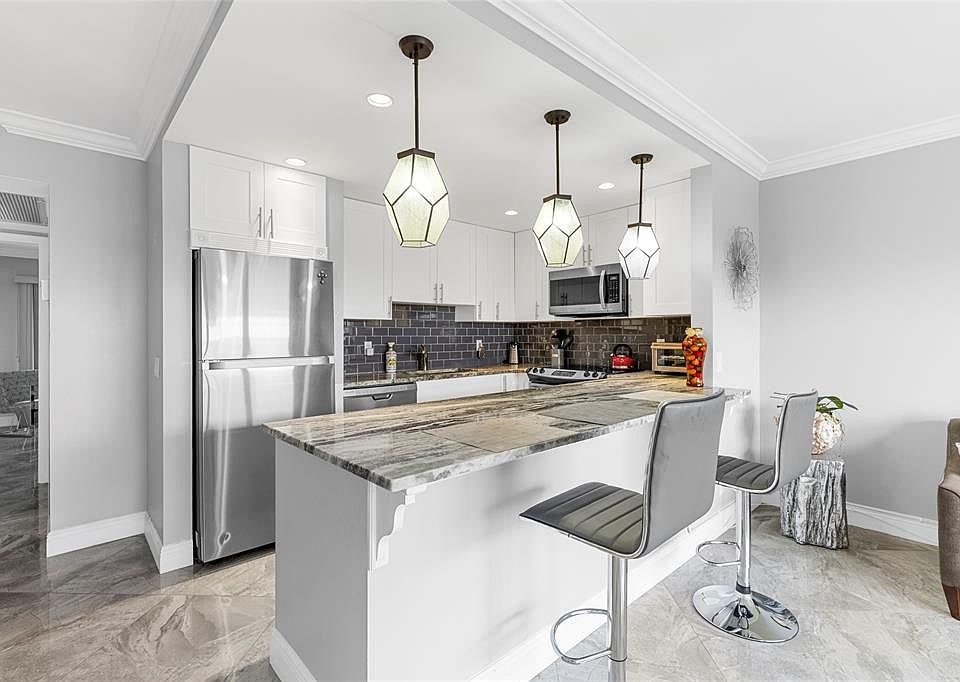 WOW! GORGEOUS 1 BEDROOM, 1.5 BATH CONDO LOCATED IN THE DESIRABLE GRANTHAM AREA OF CENTURY VILLAGE! THIS STUNNING HOME FEATURES AN OPEN KITCHEN WITH GRANITE COUNTERTOPS, STAINLESS STEEL APPLIANCES, WHITE CABINETRY AND ELEGANT PENDANT LIGHTING. XL PORCELAIN TILE ON THE DIAGONAL FLOWS SEEMLESSLY THROUGHOUT. THE PRIMARY BATHROOOM SHOWCASES A PEBBLESTONE FLOOR WITH FLOOR TO CEILING TILE AND SLEEK GLASS DOORS. YOUR BACK PATIO BOASTS AN EXPANSIVE GREEN SPACE VIEW-THE PERFECT SPOT TO RELAX AND UNWIND. ENJOY STYLISH, MODERN LIVING IN ONE OF THE MOST SOUGHT AFTER SECTIONS OF THE VILLAGE. CENTURY VILLAGE HAS RESORT STYLE AMENITIES TO INCLUDE A THEATER, INDOOR AND OUTDOOR POOLS, PICKLEBALL, TENNIS, RESTAURANT, COURTESY SHUTTLE AND SO MUCH MORE! ASSOCIATION CLAIMS 55+