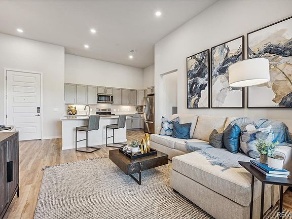 Residence 2B features a stylish and functional open-concept layout. A wide-open great room – providing direct access to a covered deck – overlooks a charming dining area and a spacious kitchen with center island and ample storage space. Additional highlights include a drop zone off the foyer, a convenient laundry room, a generous secondary bedroom and a full hall bath. The primary suite boasts a sizable walk-in closet and a lavish private bathroom with dual vanities and a benched shower. Staccato design package with white cabinets. Please contact builder for specifics on this property. Pictures are of similar model.