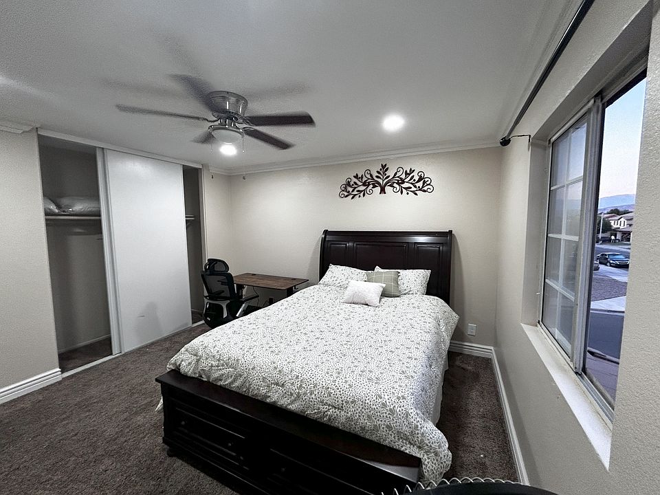 A bright and spacious private room is available in a well-maintained single-family home. The room features new queen bed, mattress and bedding, with beatiful views.