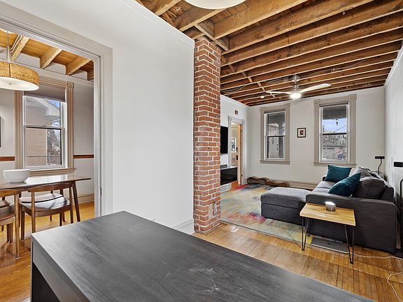 1890's brick house with modern amenities! Loft like main floor feels open featuring exposed brick and lath. Hardwood floors throughout and a large eat-in kitchen. 2 bedrooms up. Primary offers a bath and flexroom. Backyard has covered patio nice landscaping. There is 1 off street parking spot. Don't miss the "Malkovich" door leading to more storage. New roof in 17. Quick close possible. Showings start Jan. 10th.