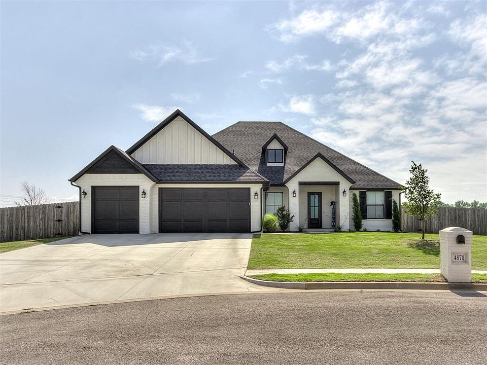 This stunning 2022 construction in Montford of Tuttle boasts a cul-de-sac setting on a nearly one-acre lot (.84 mol), offering ample space for a workshop, pool, or simply a vast yard. The home includes four bedrooms plus a dedicated study, and three full bathrooms. It features an open-concept design for the living area, kitchen, and dining space. The kitchen is equipped with floor-to-ceiling cabinets, a large island providing extra storage and seating, a gas cooktop, stainless steel appliances, a coffee bar, and a walk-in pantry. The master bathroom is designed with dual vanities, a walk-in shower with dual shower heads, a soaking tub, and a spacious walk-in closet. Additional amenities include a three-car garage, a sprinkler system, and a covered back patio with power ran for entertainment, as well as a gas hook up for a grill/outdoor kitchen.