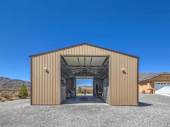 Welcome to this stunning 3 bedroom, 2 bathroom home on just under 5 acres in Pahrump, zoned for horses and surrounded by beautiful mountain views and BLM land. With 1,905 sq. ft. of living space, this property offers a bright open layout featuring granite countertops, stainless steel appliances, and a covered patio. Relax and unwind in the jacuzzi while taking in the desert sunsets. The home also includes Rolladen shutters on all rear windows for added comfort and security. The large drive-through workshop/RV garage is complete with a pellet stove/heater, water hookup with sink, and plenty of room for projects or storage. Propane and a generator are located at the well house, ensuring year-round reliability. With a 2-car garage, ample outdoor space, and horse zoning, this home blends privacy, functionality, and country living at its best.