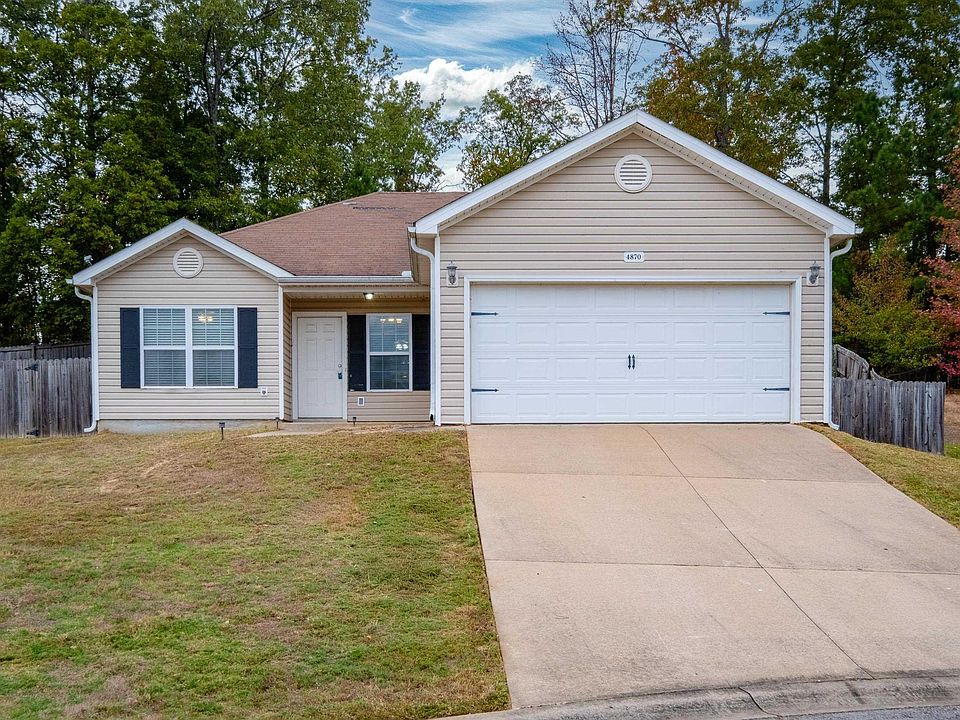 Super cute home located in the private Meadows at Centennial Valley subdivision on a cul-de-sac! This 3 bedroom/2 bath, split floorplan offers plenty of comfortable space for living and entertaining! Open kitchen, breakfast area and living room have laminate wood flooring and tons of natural light! Kitchen includes electric range and built-in microwave, refrigerator and nice storage and counter space. Large backyard backs up to woods and is fully fenced with a side double-swing gate and large concrete patio pad for outdoor living! Laundry room has both washer and dryer that stay. Located in Benton school district. Great location with easy access to I-30 for commuters, shopping, restaurants and near the home of the future Buc-cee’s! Two-car garage! This home is waiting for you – come see! Insurance has approved a new roof to be installed November 2025! Agents see remarks.