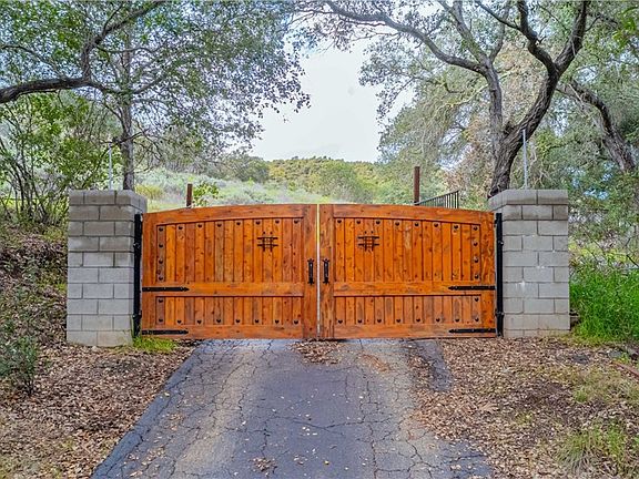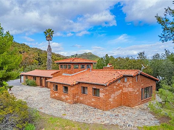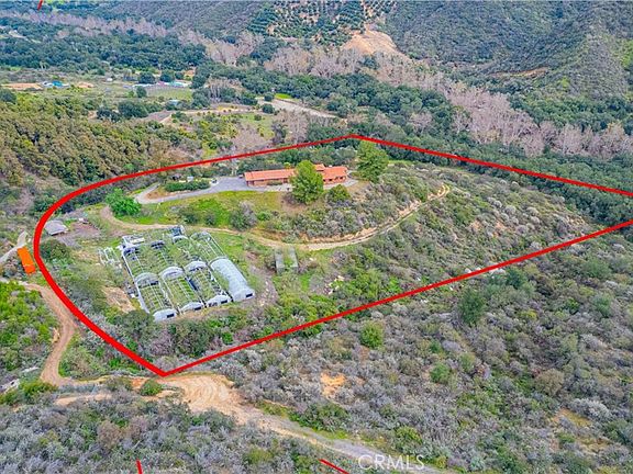 Welcome to a classic hacienda California acreage estate. This uniquely custom Spanish style home sits atop a ridge at the center of the property boasting 360 panoramic views. A tremendous opportunity to add value. The property is bordered by a seasonal stream to the west and a year-round flowing stream on the east. Beautiful for hiking and exploring. Or to simply relax and escape the summer heat in the shade of the oaks and listen to the sounds of the babbling creek. The slope from the house down to the main road is terraced with many exotic citrus and avocado trees with plenty of room to plant a grove, or vineyard or whatever you prefer. It also has an access road that circles the property making maintenance and access ability to all 10 acres much easier. The front of the property has a potential build site with water and power available for a potential workshop, garage, granny flat, etc. The back of the property has a massive 15,000 sq ft graded build site also with water and power. It currently has nine greenhouses fully equipped with extraction fans and wet walls to keep your crops cool in the summer and warm in the winter. With over 6,000 sq ft of raised planter beds you can start your own produce business or just have to means to grow all the food you could possibly want. The property was previously approved by the county to be split into 2- 5 acre parcels or to be changed to agricultural zoning. So, the use for this area is endless. Could be great location for a secondary home, pool house and pool area, horse-stables, winery or anything else you can imagine. Near the back of the property there is a fully fenced animal enclosure. That has previously housed chickens, goats, pigs, sheep, peacocks and more. So, if your dream is to have a spacious custom home with breathtaking views, private and away from the city yet close enough to the freeway and amenities. Nearly 10 acres of highly usable land with massive upside potential. Your own high producing well providing you the water you need to raise animals grow your own crops and live off the land. Multiple build sites fully equipped with power and water ready to break ground on an income producing business or to simply build the compound of your dreams? Then this is a must-see property. Note: Garage was converted to additional bedroom without permit. Square footage to be confirmed by Buyer.
