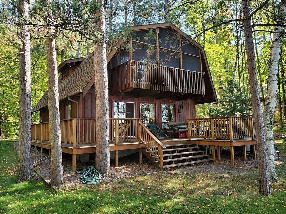 Youâll find yourself playing at the lake until the sun go down with the Lindal Cedar home on Lower Eau Claire Lake. This home is nestled within mature Red Pines and offers 150â of lake-level sugar sand beach that faces SW. Sit in the Jacuzzi off the deck or around the firepit alongside the beach and watch the sun set. Master bedroom has a screened in deck off the sliding glass door overlooking the lake. There is a 2 car detached garage with exterior stairs leading to a 27â long deck as you enter the loft for your guests with a full bathroom. This is everything a lake cottage should be. Not many places around like this. Seller is currently working with Bayfield County to file for proper permits for occupancy of upstairs sleeping quarters.