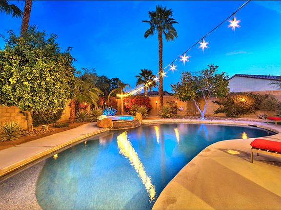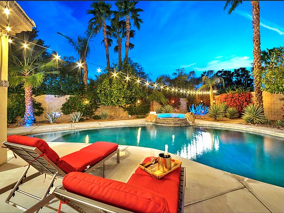 *Multiple lease term options available (i.e. 1 mos, 3 mos, 6 mos etc). Monthly Rates may vary depending on lease duration. Call to inquire for remaining availability and rate options. (Additional Villas also available).* Welcome to luxury living at its finest! Relax in the tranquil, 1/3 Acre gated private estate providing a 5-star retreat in the Palm Springs Desert area & heart of Indio California across the street from the world famous Empire Polo Field. It features 4 bedrooms and 3 bathrooms, exuding a magnificent and thoughtfully designed interior adorned with contemporary aesthetics and meticulous attention to detail. Enjoy the closest private gated community walking distance access to the Empire Polo Field, relax in the heated pool or Spa, entertain yourself and / or your kids with the variety of outdoor and indoor games including Roulette, Poker, the playground, golf, pool, ping-pong, mini-basketball, board games, or simply enjoy the breathtaking desert sunset by the fire-pit or lounge chairs with your large group of family and friends. Some Highlights of What this Villa Offers : Heated Pool Spa / Jacuzzi Netted Golf Driving Range Putting Green Table Mini-Basketball Pool Table Ping Pong Table Roulette Casino Table Poker Table 65-inch HDTV and a Wet Bar in Grand Living Room Playground & Slide for kids Several board games Conversational area Firepit with Chairs Patio dining table seats 14+ people BBQ Grill Sun Lounge Chairs Pool Tanning ledge Fully stocked Gourmet Chef's kitchen with Double Islands Well-lit outdoor space Pool Floaties Coffee Keurig machine and regular drip coffee maker Where You'll Be Sleeping (Summary) Bedroom 1 (Master Suite + Ensuite #1 of 2): 1 California King Bed + 1 Full Sofa Sleeper - Accommodates 4, with 60" TV with Ensuite Bathroom for 2 with luxury tub and separate shower Bedroom 2 (Master suite + Ensuite #2 of 2): 2 Full Beds + 1 Full Sofa bed - Accommodates 6, with 55" TV, with Ensuite Bathroom for 2 with luxury tub and separate shower Bedroom 3: 1 California King Bed + Accommodates 2, with 55" TV Bedroom 4: 1 Full Bunk Bed + 1 full roll-out bed Can accommodate 6, with 36" TV Bedroom Details The primary suite (Master Suite 1) comprises a California King bed, a full-sized sofa sleeper, a bench at the foot of the bed, a cozy reading chair, a 55-inch Smart TV, a ceiling fan, a walk-in closet, a dresser, and private access to the sunroom in the backyard. The en suite bathroom provides a tiled shower, a generously sized soaking tub, and dual vanity sinks with tiled countertops. Adjacent to the primary suite, Suite 2 (Master Suite 2) includes two full-sized beds, a full-sized sofa sleeper, a 55-inch Smart TV, a remote-controlled ceiling fan, a walk-in closet, and a dresser. The en suite bathroom features a tiled shower with a bench and tiled countertops with a vanity sink. Bedroom 3 is located next to Suite 2 and features a California King-sized bed, a 42-inch HDTV, a ceiling fan, a reach-in closet, and a dresser. Bedroom 4, positioned near the kitchen, showcases a full-sized bunk bed, a 42-inch Smart TV, a remote-controlled two-blade ceiling fan, and storage space beneath the TV. The hallway's full bathroom includes a tiled shower with a bench, a toilet, tiled countertops, and a sink. Additional Amenities Wireless internet access, premium quality bed linens, bath and pool towels, along with a starter set of L'Occitane toiletries in each bathroom. A fully equipped laundry room complete with a washer, dryer, ironing board, and iron. Ample off-street parking space for up to 6 vehicles. Living Room Features The interior space of this single-level residence spans 2,700 square feet. The grand room accommodates 12 individuals and showcases a fireplace, a 65-inch HDTV, and a wet bar. Kitchen Details The kitchen is fully equipped and incorporates a double island, sleek black appliances, and ample storage. Appliances include a GE profile double oven, perfect for holiday gatherings or family reunions, a spacious French door refrigerator with a freezer drawer, microwave, dishwasher, and a cooktop embedded in one of the islands. The second island offers seating for three at the kitchen bar and a sink. The dining room features seating for six in comfortable black upholstered chairs. The laundry room is situated down the hallway on the right side of the kitchen. Estimated Travel Times for Key Locations Empire Polo Fields: Less than 5-min Old Town La Quinta: 6 min Indian Wells Tennis Garden: 10 min Palm Desert/El Paseo: 15-18 min Downtown Palm Springs & Airport: 30-35 min LA; SD; or OC: About 2 hrs without traffic Pickleball / Padel and Tennis players - Fritz Burns park is 10 minutes away with 6 tennis courts and 8 pickleball courts lit and open from Dawn until 10 pm. Multiple lease term options available (i.e. 1 mos, 3 mos, 6 mos etc). Monthly Rates may vary depending on lease duration. *Call to inquire for remaining availability and rate options. Pets welcome! Pet-fee of $350 per pet applies. Tenant may request periodic cleaning available at additional fee.