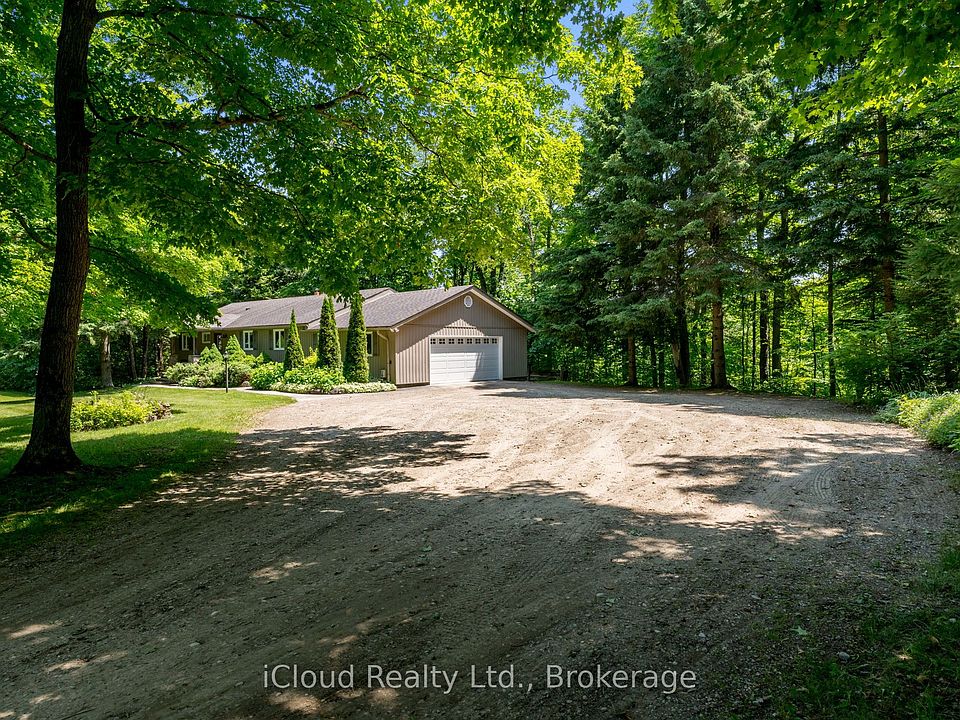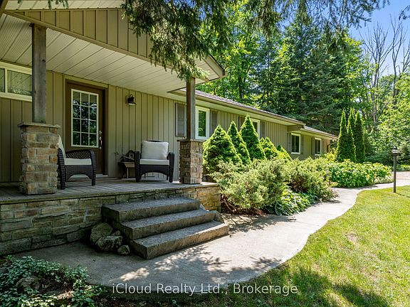 Nestled back from the road, secluded and serene, this 7.85 acre home could fulfill many dreams. An attractive 3+1 bedroom bungalow on rolling land, a pond, a stream and woods make it truly special. The welcoming front porch & foyer lead to a sunlight filled living room w/a huge walk-out to the deck & a show stopping floor to ceiling stone fireplace flows beautifully to the dining room with stone feature wall, metal circular stairway & picture window. The eat-in kitchen is well appointed with timeless cherry cabinets, stainless steel appliances & gas range. Direct access to the deck & garage is a great plus as is the adjacent the 3 piece bath with heated floors. The dreamy primary bedroom with its garden doors, walk-in closet, next door bath with jacuzzi tub, offers, as well, access down the outside stairs to the outside shower - so cool! Downstairs in the Rec room one finds a second impressive floor to ceiling stone fireplace with air tight wood insert as well as a walk-out to the patio/side yard. Imagine curling up here to read, watch TV and enjoy. Tucked in beside is the office/den/4th bedroom. This level also boasts a inviting in-law apartment space with combined dining, living and small kitchen, bedroom & 3 pc bathroom plus inviting garden doors opening to the small private patio. Meandering pathways lead past a little log cabin, a bold vista, overlooking a small change house, and a stunning spring fed crystal clear 100' diameter swimming pond. Beyond are more pathways into the old growth forest. You are enveloped with quiet and the sound & sight of the winding stream and the delight of little bridges spanning the flow. An old "rough" sugar shack is hidden on the slopes along the trail. Located just south of Hwy 89 & east of Hwy 10, this country property offers enticing rural living within easy reach of town and beyond. The Bruce Trail, Mono Cliffs Park & Boyne trails are minutes away. It's an absolute pleasure to visit!
