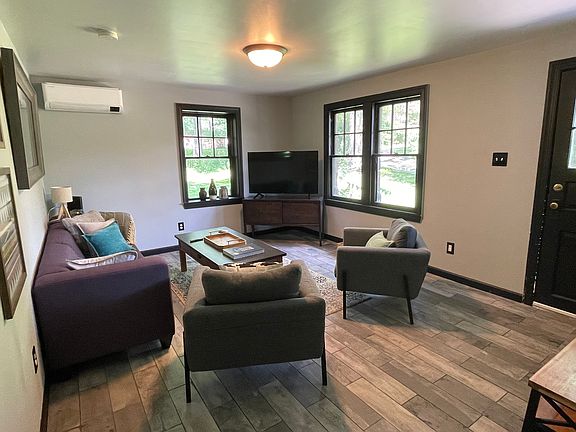 FURNISHED first floor unit of a recently renovated stone cottage set far back from the road with private entrance on a large, bucolic property with easy downtown Amenia walking access. 2 bedrooms, 1 bathroom, large kitchen with modern appliances, living room, outdoor deck and yard. Electric air conditioning / heat mini-split units in both bedrooms and living room as well as baseboard heating in kitchen and bathroom. Lots of light. This unit comes furnished.