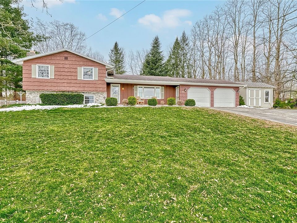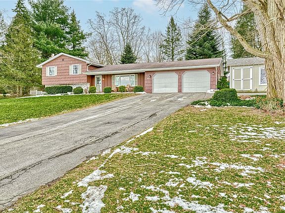 Want a country setting, nearly an acre, only 5 minutes from Canandaigua City? Beautiful views to front, sit on the covered front porch & enjoy the farmland! House has some unique features: terraced lawn is amazing for parties w/family & friends! Kids can play on top lawn w/swings, zip lining & more, while adults hang on the deck or patio overlooking pool! Lots of privacy & VERY quiet neighbors to West! Family room w/new gas log fireplace surrounded in brick. Built in area for books & media! Room sizes are huge! Hutch in kitchen w/breakfast bar will remain. Formal dining & living rooms are open to front & back yards. Primary bedroom has huge walk-in closet w/another to the side, other bedrooms have double closets. 2 full baths. Current play room walks out to the back. Could be a guest bedroom with its own bath. Full basement is huge w/rock climbing wall, laundry area, and built in cabinets for storage. There is even an area for a wine cellar. 2 car garage w/opener and a new custom doggie door from garage. Seller will refinish hardwoods prior to closing depending on offer price. Delayed showings until Thursday, 3/28 at 9:00am. Offers due Wednesday, 4/3 at 4:00pm.
