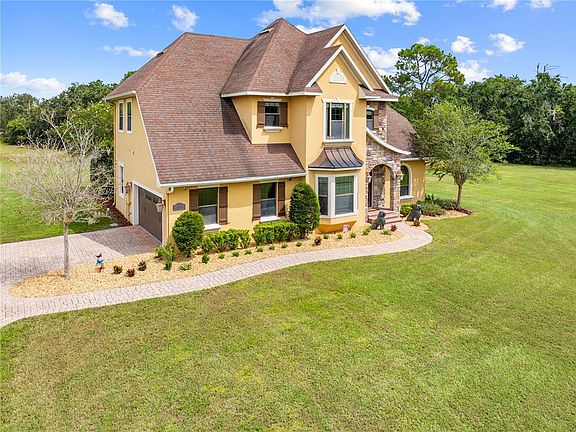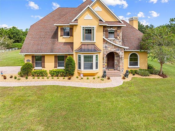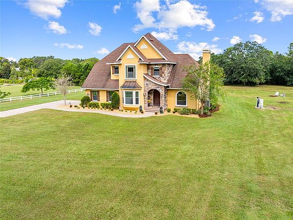 Introducing the exquisite and immaculate 4875 Jones Road where the architectural grandeur is an elegant sight to see. Sitting stately on five pristine, oak-hammocked acres, this custom-built, one-owner home is awaiting its next family to endure all of the timeless luxuries it beholds. Sprawling over 3,000 total square feet, inclusive of four bedrooms and three bathrooms, this stylish, unique property exudes space. Its concrete block, stem-walled composition adds to its durable construction and soaring heights. Foam insulation installed in walls for superior energy efficiency. Have peace of mind with no HOA or CDD, comfortably highlighting modern convenience, meshing with country charm. Park on the pavered driveway, and stroll along the cobblestone sidewalk, for the solid-wood front door will steal the show. Upon being welcomed by the Foyer, the 10-ft ceilings (both levels), hardwood flooring and spiral staircase immediately captures the eye. Conduct meetings in the exclusive Office, characterized by custom woodwork and floor-to-ceiling, built-in shelving, crafted with attention to detail. The Formal Dining Room is designed with a banquette, bay windows and a gallery wall, creating a warm and peaceful setting. Proceed forth through the decorative Roman archway, into the Butler’s Pantry to meal prep, store china and serve feasts. In the heart of the home, the open and airy Kitchen reveals 42” cabinetry, framed in crown molding, paired with granite counter tops and tile backsplash. Functionality was kept in mind with concealed, built-in spice drawers and outlets above cabinets. A stand-alone island creates a focal point, wrapped in dark mahogany, with a prep sink, shelving, storage and a countertop-overhang for barstools. Defined space is reserved for the Casual Dining Area with a tiled central wall, adding texture and visual interest. Open-concept living is featured in the Family Room where the centerpiece displays its majesty: the striking, wood-burning fireplace with ornate stone from floor to ceiling and luxury vinal planks, embellishing each side. Oversized windows project natural light, decorated with crown molding, custom trim and window treatments. Secluded downstairs is a Guest Bedroom and full Guest Bathroom, ideal for an elderly parent or adult child. Tucked away on the second story is the Laundry Room, two Guest Bedrooms and Guest Bathroom. The Primary Bedroom and Ensuite present a peaceful retreat, featuring a spacious walk-in shower, alongside a free-standing, soaking tub, adding a spa-like touch. Separate his and her vanities permit for a personalized set-up. Notice the custom, primary closet system and ample space, thoughtfully designed for clutter-free organization. Downstairs, classic French Doors provide a seamless connection, allowing access to the stunning 25x50 Covered Lanai. Entertain year-round under the vaulted outdoor ceiling, lighting and fans, fitting for indoor/outdoor living. Mature Oak trees and land exemplify nature and wildlife. Memories are to be made at the masonry pit. Vast space available for a future summer kitchen, pool, outbuilding and to store recreational items. Plant seeds and watch a garden grow, while the horses graze. Located about three miles from schools, Chisolm Park and five miles shy of the booming and vibrant Lake Nona. Minutes from SR-417, providing commute to famed area attractions, Orlando International Airport and east-coast beaches. This classy gem is move-in ready and built to last.