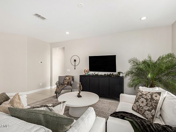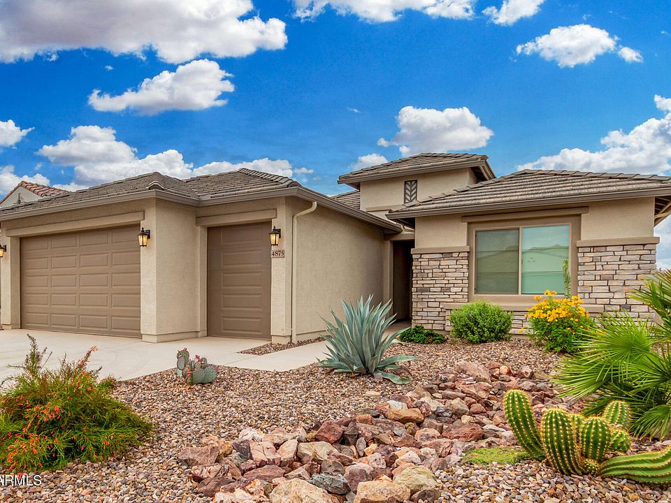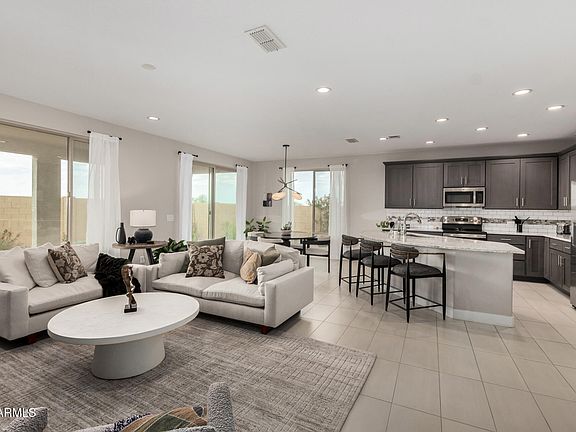 Beautifully upgraded, like new Montecito model in one of Arizona's premier active adult communities! From the inviting driveway to the stunning interior, this home shines with high-end finishes. Inside you'll find luxury plank tile flooring, granite counters, cabinetry with pull-outs, and a granite composite farm sink with reverse osmosis. Bathrooms feature quartz counters, tiled shower surrounds, and comfort-height toilets. The extended primary suite offers a spa-like ensuite with dual vanities, walk-in tiled shower, and spacious closet. Outdoors enjoy an extended covered patio, pavers, professional landscaping, fruit trees, gutters, and mountain views. The extended garage, plus a golf cart garage complete this move-in ready home!