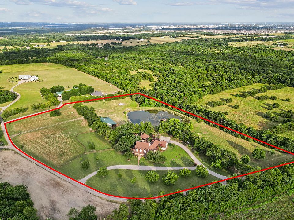 Discover a perfect blend of luxury, functionality & serenity in this 10-acre estate—with NO City Taxes & current ag exemption. Unique property features beautiful 5,344 sq ft main residence & 1,933 sq ft guest house, offering comfort & space for multi-generational living or entertaining. Main House features a charming covered front porch, wood floors, custom built-ins & designer touches in a 6 bedrooms & 4.5 bath floorplan. Private study with glass front doors. Expansive formal dining room & spacious living room with stone fireplace & built-ins opens to kitchen with granite countertops, island, gas cooktop, double ovens, ss appliances, pantry, glass-front upper cabinetry with lighting, bar seating & large breakfast area. Downstairs primary suite has bay window seating & spa-like bath with dual vanities, soaking tub, walk-in shower & his & her closets. Secondary downstairs bedroom with full bath. Upstairs has game room with built-in bar, cabinetry & beverage fridge plus additional bonus space. 4 additional upstairs bedrooms & 2 full baths plus powder bath off game room. Large utility room with sink, countertops, cabinet storage, beverage frig plus room for freezer. 4 Car attached garage. Separate Guest House features open-concept living, a modern kitchen with ss appliances & granite countertops, primary bed & bath downstairs. Upstairs features a game room, 2 additional bedrooms & 2 full baths. Attached large storage or garage area. Enjoy the outdoors on 10 quiet acres with your private pond, fenced in horse stable area, resort-style pool with diving board, waterfall & separate spa-all beautifully landscaped with trees & blooming plants. Expansive covered outdoor living space with bar, fridge, grill, sink, fireplace, ceiling fans & lighting. Large uncovered patio with fire pit, outdoor fireplace & multiple seating areas. This property offers it all—tranquil living just minutes from McKinney’s conveniences, with space, style & sophistication rarely found in one package.