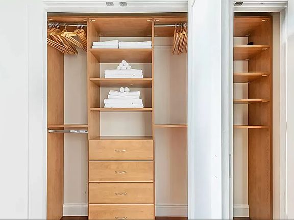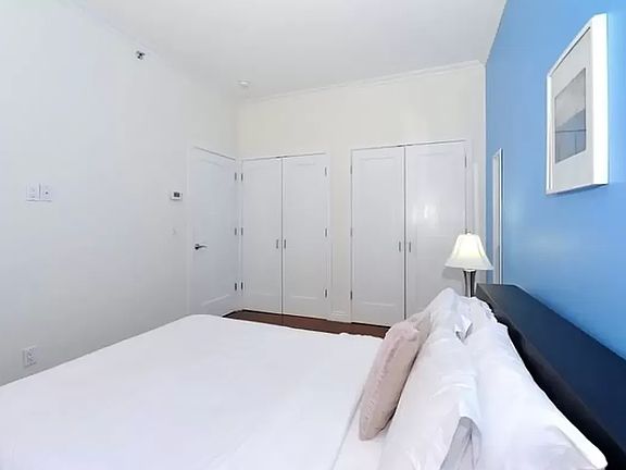 Five (5) Huge custom built large closets in this large one bedroom with a wall of windows facing east including windows in the bathroom, grey newly finished cabinets with stainless steel appliances and hardwood flooring throughout.
