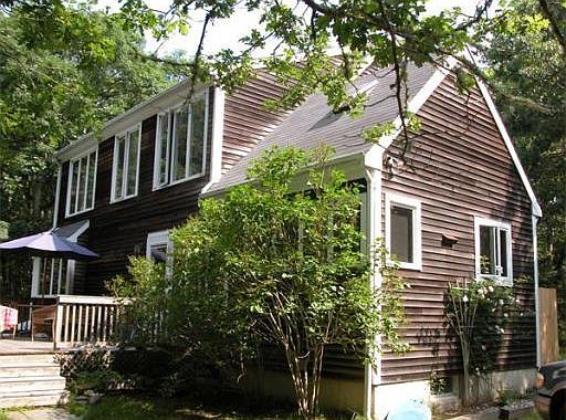 Scenic, wooded 2.1 acre West Tisbury setting for this classic center chimney, clapboard sided Vineyard farmhouse. Designed to absorb as much sunlight as possible, the 3 bedroom /2 bath home is cheery throughout the day... And cozy at night with 2 "crackling" fireplaces. Main level has an open design with oak flooring, an updated kitchen, sunroom with cathedral ceiling and one bedroom. Upstairs is a large master bedroom with fireplace, a full bath, a computer nook and a guest room. Included is a detached 480 sq ft bedroom with bath; passive solar design. Presently rented for $900/month. Located near the State Forest, Seppiessa Land Bank property and Longpoint Beach.
