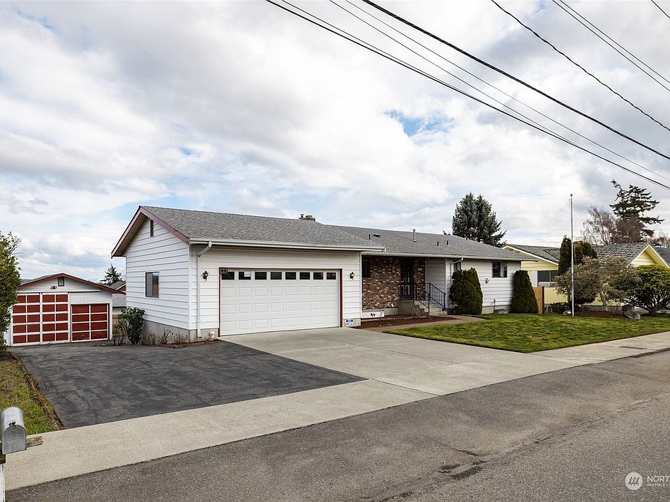 Enjoy stunning sunrise & Mt Baker views from this outstanding daylight rambler, set in the heart of town in a wonderful established neighborhood. Main level offers generous living w/vaulted ceilings, cozy gas FP & a wall of windows to soak in the view! Generous kitchen presents loads of storage & opens to spacious view dining w/slider leading out to entertainment deck. Primary on main w/ensuite bath, walk-in, slider to view deck, plus generous guest bdrm & full guest bath. Expansive lower level complete w/huge rec-room, 2 add’l guest rooms, full bath, + office/den easily converts to 5th bdrm. Large utility w/sink & storage affords opportunity for 2nd kitchen. Excellent 20x26’ detached Shop w/RV bay! Easy care mature landscape w/fruit trees.