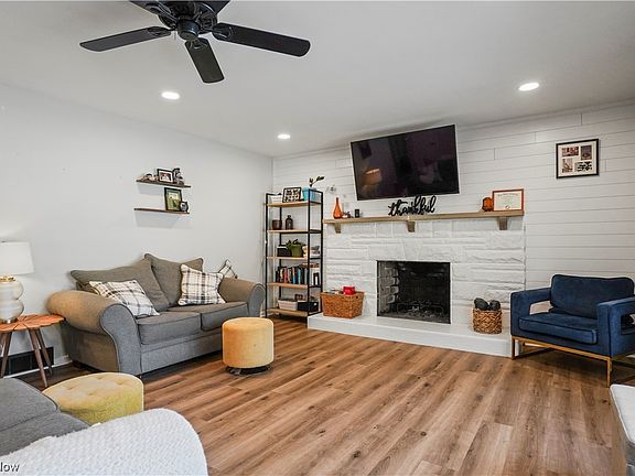 Beautiful Brick Ranch on 1/2 acre in a lovely well maintained Akron neighborhood. The floor plan is open and light and bright. The first floor has been updated with Luxury Vinyl floors and new light fixtures throughout. The living room has a large bay window and white wood burning fireplace accentuated with shiplap. The impressive kitchen has attractive cabinets with some open shelving, a stainlees steel farmhouse sink and a large pantry with sliding barn door. There are three generous sized bedrooms and a beautifully updated full bath. The lower level has a 42 x 14 nicely finished rec room with a second fireplace, a laundry room and a utility room.