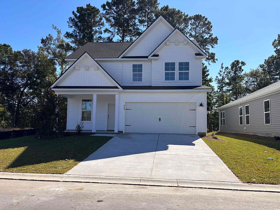 Live less than 6 miles to the beach at Bluffs at Sun Colony! Home completed by mid-September. The Catamaran is a great 2-story plan with an open concept kitchen and large island overlooking the family room. THOUSANDS IN FREE OPTIONS INCLUDED! Flex room at the front of the home is perfect for a living room, study, or formal dining. Three bedrooms are located on the second floor along with the spacious owner's suite, featuring an ensuite bath with a dual vanity, walk-in shower, and huge walk-in closet. Enjoy the rear covered porch backing up the Colonial Charter Golf Course! Great wooded views in the front; no homes obstructing either view! A must see!