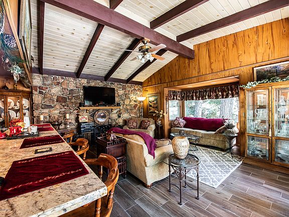 Motivated Seller! This wonderful mountain home offers 3 bedrooms and 1 & ¾ baths. On the main floor you'll enjoy a lovely living room with a beautiful stone fireplace, a bay window, and nice wood-like floors. The tastefully remodeled kitchen has granite counter tops, tons of storage, a pantry, a bright and airy dining room, and two bedrooms along with a full bath are on the main level. Upstairs is the master suite with a balcony and tree top views that you'll love. On the entry level is a large and open den and family room that is perfect for entertaining. You'll also find an enchanting deck to take in the pleasures of the beautiful outdoors. Lake Gregory is close to this spacious home, where you can just sit back and enjoy!