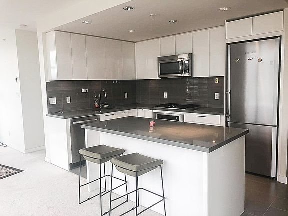 Corner homeOpen-concept livingSleek stone countertopsLarge balcony