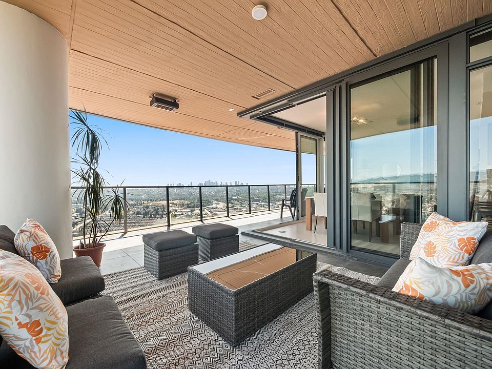 Sub-penthouse at Concord Brentwood Hillside East with unobstructed, 270° views from the mountains & Indian Arm to Mt. Baker to Metrotown then all the way to the Gulf Islands! This south facing, 2 bedroom, 2 bathroom corner suite offers 1,059 sqft of modern living plus an incredible 638 sqft of heated outdoor space. Expansive, corner sliding doors fully open to seamlessly blend indoors & out—expanding your living space and perfect for entertaining. Morning coffees and evening glasses of wine have never had it so good! Sleek, contemporary design & open layout with quality finishings & air conditioning. The complex offers exceptional amenities, 24/7 concierge, and is just a short walk to vibrant Brentwood Mall & Skytrain. One parking & storage locker included. Open House: Sun, Oct 5, 2-4