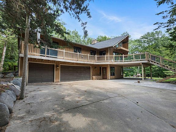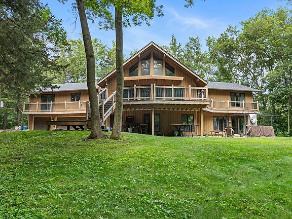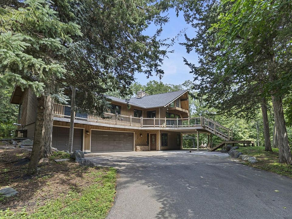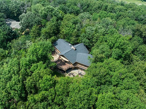 Nestled on over 2.5 wooded acres, this gorgeous high-quality custom-built chalet-style home offers the perfect blend of comfort, privacy, and craftsmanship. The heart of the home is a soaring two-story great room with cedar-lined ceilings and a stunning two-sided stone fireplace—warm and welcoming with expansive windows that bring the outdoors in. The open kitchen and dining area flow seamlessly into the main living space and out to a spacious wraparound deck—perfect for relaxing, grilling, or entertaining among the trees. A newer shared concrete driveway offers a smooth arrival and plenty of parking, complementing the abundant garage space for vehicles, tools, and toys. Three bedrooms are conveniently located on the main level, including a generous primary suite with a private bath. You'll also find main-floor laundry and a bonus loft, ideal for a home office, reading nook, or extra sleeping space. Recent mechanical updates include a new furnace and A/C, offering year-round comfort and peace of mind. The walkout lower level expands your living space with a large family room, additional bedroom and bath, and ample utility and storage space. Just outside, a brand-new patio creates another great spot to gather, leading to a firepit area tucked into the woods. Enjoy the quiet and privacy of life in the woods, with easy access to Hwy 169 and I-35W just minutes away. A truly special property with space to unwind, gather, and enjoy every season.