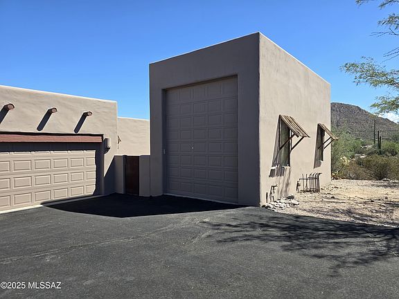 Classic Sante Fe style home on an acre! Mountain and city views! 4BR/2.5BA with an attached 3 car garage and a separate 24' RV garage with hookups! Recently had exterior painted, roof coated, driveway recoated, primary bathroom remodeled, kitchen cabinets redone, newer tankless water heater. Enjoy 2 covered patios for eastern shaded evenings overlooking the lush landscaped yard/pool/spa with no rear neighbors and desert and city views! All furnishings included in sale, even the safe. Solar lease has been paid off! Enjoy low TEP bills until 2035! Fridge, washer/dryer all convey. HOA is now inactive. Has a termite warranty!