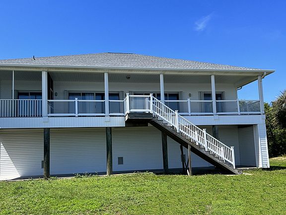 Sensational 180 degrees view of the Intercostal Waterway! The airy Entryway, Living Room, Dining Area and open Kitchen, Master Bedroom, Second Bedroom, and spacious covered back terrace - all with direct and unobstructed waterviews and offer views of pristine white sand natural preserve along Gulf of America! Coastal zone requires the house was constructed on piles. Gracious stairwells lead to the front patio and the back terrace. The living area features vaulted ceiling. Split floor plan sets master suit apart from the other two bedrooms and a bonus room. Tile throughout and in Master Bedroom carpet installed brand new. All home living is located on upper floor whereas the entire ground floor is used for garage and large storage space set for workshop. The house has gutters, septic tank, and sprinkler system installed. Municipal sewer is available for connection. The waterfront terrace has clear view railing panels, screened in-porch and is complete with maintenance-free Trex decking. The house uses natural gas and has underground electric connection. It is also equipped with tankless water heater, energy-efficient 4-ton Trane HVAC, and a heat pump with gas back-up. The house is plumbed for natural gas generator. New roof provides ample warranty. Attic has been sprayed with insulating foam for energy efficiency. All windows and sliding doors are supplied with custom fitted Accordion Hurricane Shutters. The boat dock has power and water lines, needs repairs. No Association. Currently the house is unoccupied and move-in ready! Fits well for a single family with kids and pets or for working from home professionals, and suits for the retired couple. Or, the house is perfect to run the Air B&B!