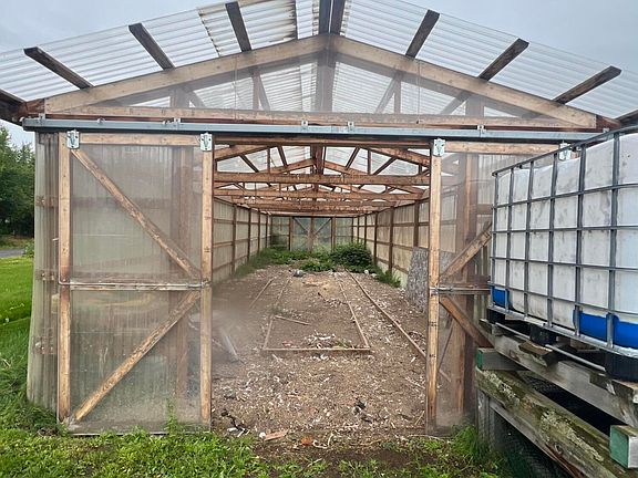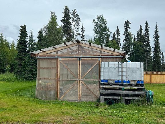 Bring your tools and finish off this large shop w/carport and living space! 1 bedroom, 1 bath on 2.09 acres not far from town and with pond access. Huge 16 x58 greenhouse. So many possibilities! 580 sq ft according to borough but sellers have walled off and insulated 13 x 30 ft of additional living space. Sellers will continue to work on finishing this up until it sells.