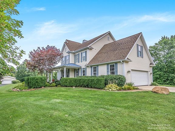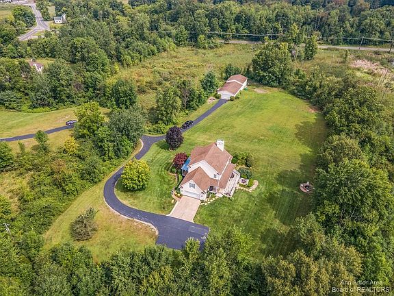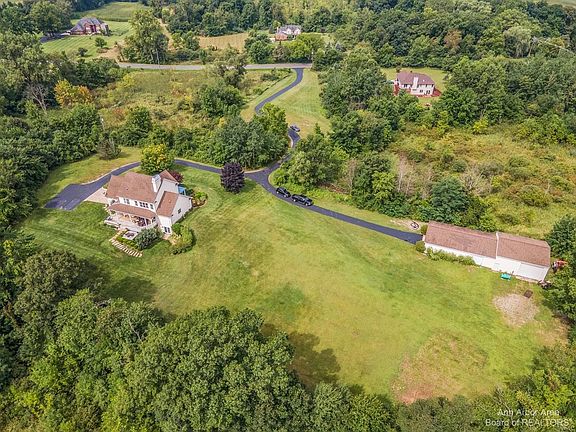 Best and Final Aug. 20 at 1:00pm! Plenty of privacy on this nearly 6 acre oasis hosting a 2700 SF home with finished w/out basement plus pole barn! Covered front porch invites you in to tile entry and front family room/office with hardwood floors leading to two story great room with a wall of windows & tile wood FP. Updated granite kitchen features generous snack bar, built in China cabinets, SS appliances & adjoining dining room leading out to rear entertaining deck & great fire pit. Main floor primary ste had tray clg, new tile bath with heated floor, granite top, big tile shower & garden tub. Upstairs offers 3 beds, one with w/in closet, one big enough to share & full tile bath with granite & vessel sink. Fin w/out has plenty of rec/family space, wet bar, built in safe, wall of closets & large storage room. 32x80 SF pole barn & plenty of woods for hunting & wildlife viewing while being just a minute to the freeway or 5 minutes to downtown Chelsea and all it has to offer. Sellers need occupancy until early to mid November.