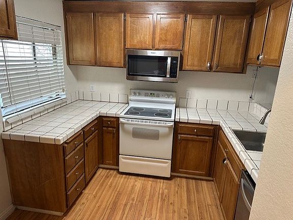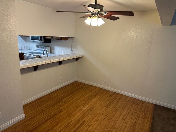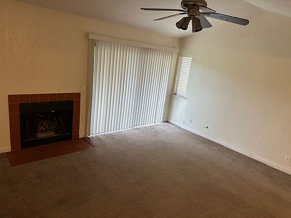 Open floor plan with a dining room that flows into the great room. The great room features tall ceilings with a fan, a cozy gas fireplace and slider to the back patio. Kitchen has a brand new microwave oven, lots of cabinets, plenty of counter space for meal prep, smooth electric cooktop/oven, and stainless steel dishwasher. Laminate flooring throughout. All 3 bedrooms are very spacious and have carpet. The isolated owner's suite has a large walk-in closet and access to the patio. Enjoy the community pool on those hot Fresno days! Good sized back patio to plant flowers or enjoy a BBQ!