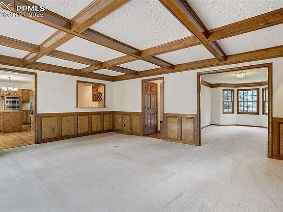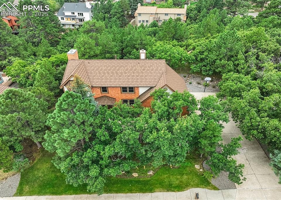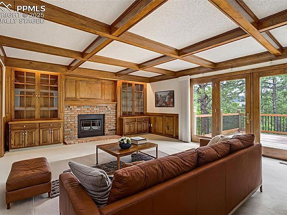 Set in the Broadmoor Bluffs neighborhood near D-12 schools, this home combines mountain & city views w/ a private, nearly half-acre lot close to parks, trails, shopping & military bases. A covered entry opens to solid oak hardwd flrs & a formal living rm framed by a bay window, crown molding, & views of the landscape. From here, the layout flows into the great rm where craftsmanship stands out, beamed ceiling, wainscoting paneling, built-ins, FP, & a wall of windows w/ walk-out access. An integrated bar w/ sink, granite counters & storage enhances the space while keeping everything tucked neatly away. The adj gourmet kitchen offers an eating nook surrounded by windows & deck access, plus hardwd flr, center island, granite countertops, updated lighting, tile backsplash,SS appliances incl range-top & GE Advantium wifi enabled wall oven, pantry, & built-in work area. A formal dining room connects easily, designed w/ crown molding & chair rail. Completing the main lvl is a half bath & a laundry room w/ sink, cabinets & window. Upstairs, the primary suite features a tray ceiling, sitting area w/ wd-burning FP, & large windows. The adj 5-pc bath has vaulted ceilings, soaking tub, glass shower & tile flooring, plus a massive walk-in closet w/ custom shelving & bonus room. Three additional bedrooms share the upper level each spacious w/ large closets & new carpet throughout. One bedroom captures mountain views, while all share easy access to a hall bath w/ tiled surround.The finished bsmnt expands the living space w/ a rec room anchored by a FP at one end & open space at the other, plus a bedroom & bath nearby. storage room w/ built-in shelving. Outdoors, a composite deck w/ wrought-iron railing overlooks the xeriscaped backyard, complete w/ fenced garden space & privacy from mature trees. The lot feels secluded while still connected to every convenience. Add highlights incl central A/C, HE furnace, metal tile roof, brick & stucco ext, oversized 2-car garage.