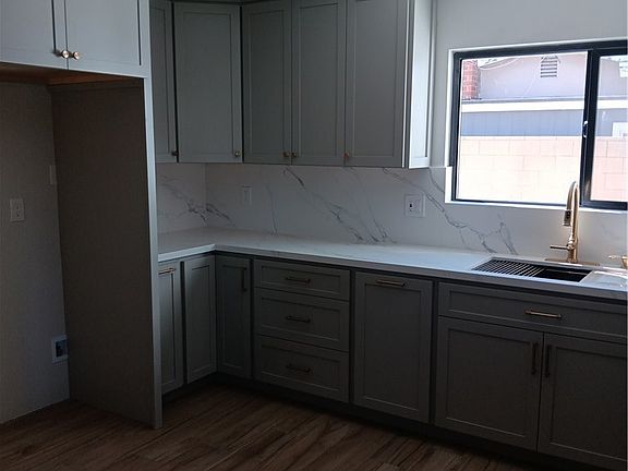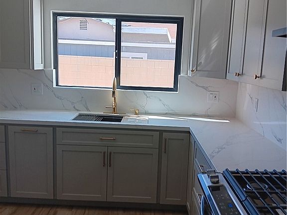 THIS ONE HAS BEEN BEAUTIFULLY DONE !! This one was just renovated from top to bottom and no expense was spared. It's a 4 br 2 ba 2 car gar. 1396 sq ft. house 7600 sq ft corner lot in a low tax area.Close to schools, shopping and fwys. Everything was done tastefully and with quality materials and it shows. You can just see the craftsmanship. Living room has a huge sliding door and custom made wall panel with a built in electric fireplace.There is new paint, windows, and the windows are Low E . Thicker glass was used for better efficiency. New solid core front doors. All interior doors have been replaced to match. Even the hinges and knobs are new. It has new electrical recepticles and all new lighting. Recessed lighting in living room, kitchen and bathrooms. plumbing is copper pipe. All new faucets in gold finish very tastefully done. New floors throughout the whole house. 6 inch base moulding. The Kitchen has custom kitchen cabinets Quartz counter tops and matching backsplash that goes all the way up to the bottom of the upper cabinets. Both bathrooms have custom floating vanities , Qurartz counter tops, and Rain showers sprinkler heads, also frameless shower doors.Property has Concrete all around. Low maintnance yard sprinklers both front and back. There is block wall fencing all around with possible RV parking on one side. There is even a covered patio in back.