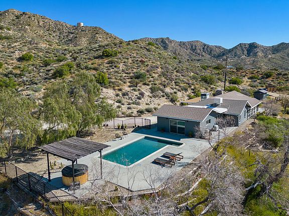 Embrace the allure of the high desert with this stunning mid-century modern home extensively remodeled by Los Angeles designer Carolyn Greco. The property boasts spectacular views and offers the best of both worlds, just 20 minutes from Palm Springs and 20 minutes to Joshua Tree. With 2400 sq. ft. on 5 acres, this home features three bedrooms, a lounge, an office, two baths a pool, and a cedar hot tub. From the moment you enter the home, you'll be struck by breathtaking views that embrace scenic canyons, sweeping hills, and majestic mountains. Retaining many of its original features and meticulously renovated, the house is the perfect blend of midcentury and contemporary design. Once inside, you will find soaring pine tongue and groove open beam ceilings, a massive stone wall fireplace, and pot belly stove. Complimenting the stylish organic feel, there are polished concrete floors throughout. Large windows flood the home with natural light, showcasing unobstructed panoramic views. The all-new gourmet kitchen features Ann Sacks tiles, abundant cabinets and work space with quartz countertops, PRO French Door Fridge/Freezer, Pro DW, and stove. The primary bedroom features a deep luxurious freestanding soaking tub with magnificent mountain views and sliding doors open onto the pool and hot tub. Completely renovated spa-like bathrooms have Phylrich plumbing fixtures, new walnut cabinets and quartz countertops.