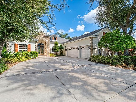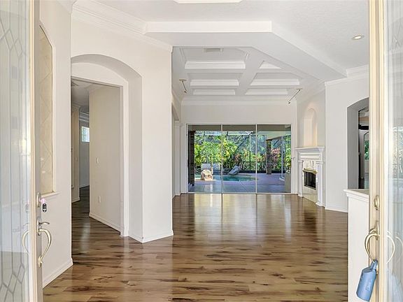 Welcome to Treymore – A Private Retreat of Luxury and Style This stunning open-style home, surrounded by lush tropical landscaping, is located in the sought-after gated community of Treymore. From the moment you arrive, the beauty of mature trees, blooming gardenias, and orchids in the branches set the tone for this elegant residence. A new slate tile roof (2022) enhances the home’s curb appeal and value. The side-load three-car garage, complete with a Garage Tek wall system and workbench, offers ample storage and a private driveway with plenty of guest parking. Step through the double front doors and experience high coffered ceilings, refined architectural details, and a seamless open floor plan. The formal dining room features a view of the front gardens and a convenient pass-through to the kitchen, while the living room centers around a double-sided fireplace, perfect for cozy evenings or entertaining. The open kitchen and family room are the heart of the home, offering generous counter space, built-ins, and a bright breakfast nook overlooking the custom pool with waterfall and lush landscaping. Two covered lanai spaces, an outdoor kitchen with gas hook-up, and elegant evening lighting create the perfect setting for relaxed outdoor living. The private owner’s suite is a true sanctuary, featuring pool and lanai access, serene views, and a luxurious spa-style bath with dual sinks, vanity, and double walk-through showers. The guest wing provides two spacious bedrooms with new wood-look tile flooring, a full bath, and a half bath for convenience. Upstairs, a large bonus room offers flexible space for a hobby area, or guest retreat. The home office provides an ideal workspace, while the media room with en suite bath offers flexible options as a fourth bedroom or guest suite.Treymore offers privacy and beauty while being conveniently close to UTC Mall, fine dining, SRQ Airport, the Ringling Museum of Art and Mansion, USF/New College, downtown Sarasota, St. Armands Circle, and Lido Beach. Experience luxury living in Treymore — where elegance, comfort, and location come together beautifully.