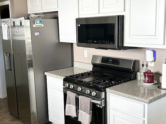 Chic fireplaceSeparate dining areaStainless-steel appliancesDeep closet spaceWhite cabinetsBeautiful countertopsSpacious kitchen