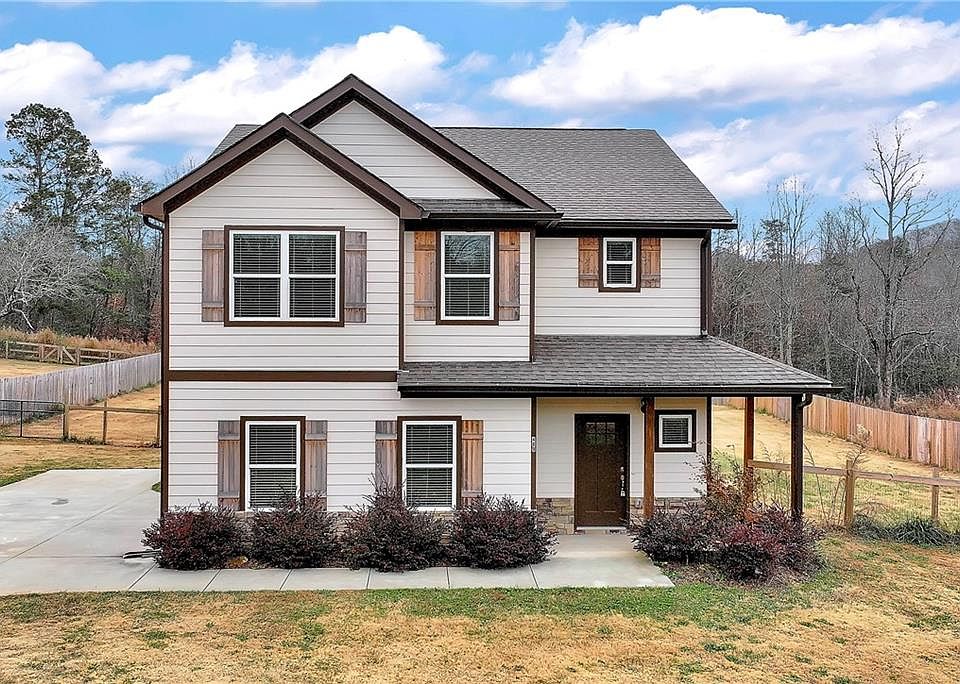 Welcome to this comfortable and modern 4-bedroom, 2.5-bath home, built in 2022 and set on a level 1-acre lot just minutes from downtown Cleveland. This home features an open floor plan with durable LVP flooring throughout and a neutral paint palette complemented by upgraded light and plumbing fixtures. The oversized living room includes a rock fireplace and opens to the kitchen, which offers a large island, farmhouse sink, solid-surface countertops, stainless steel appliances, and a roomy walk-in pantry. The dining area leads to a walk-out patio with an outdoor fireplace, making it a great spot for gathering with family and friends. Upstairs, you’ll find four spacious bedrooms, two full baths, and a convenient laundry room. The primary suite includes a large walk-in closet and an ensuite bathroom with a custom tile shower and double vanities. The fenced backyard provides privacy and plenty of usable space. With easy access to schools, shopping, restaurants, Helen, and Hwy 400, this home offers everyday convenience in a great location.