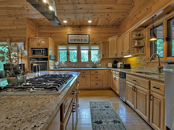 Discover the epitome of mountain living in the popular My Mountain community. This charming retreat is nestled on an incredible 1.4-acre gentle lot, boasting a beautiful yard perfect for kids and pets. With its open floor plan across two levels, this home is designed for both comfortable living and entertaining. The main level features a spacious master suite, complete with double closets, custom-built cabinets, and a full bathroom featuring a double vanity and a large tiled shower. The custom kitchen, equipped with a roomy breakfast bar, seamlessly flows into the dining area and an oversized family room. Highlighted by a stone fireplace, this space is further accentuated by a breathtaking 26-foot wide wall of custom windows, perfect for enjoying stunning mountain sunsets. Plenty of outdoor entertaining space from the two screened in porches and open deck space. The terrace level expands your living space with two additional bedrooms, a man cave, a full bathroom, and a one-car garage. A full-house generator ensures your comfort is never interrupted. The warm wood interior adds to the inviting ambiance while remaining open and airy, making it ideal for hosting gatherings. Ample parking space, including a car port, accommodates all your friends and family. Outside, immerse yourself in the beauty of the gentle lot and expansive outdoor space. Whether you're escaping to the mountains for a weekend getaway or planning a full-time stay, this home promises relaxation and tranquility.
