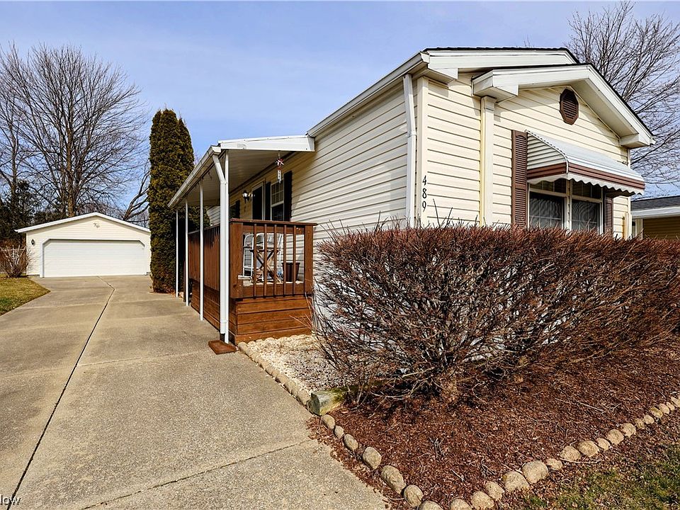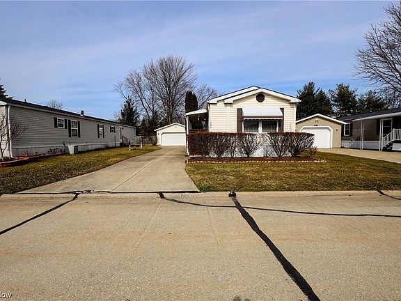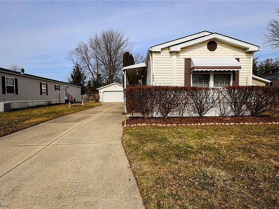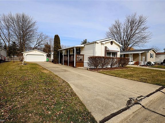 This cleverly designed manufactured home in highly desirable Golfway Pines in Painesville is ready for you! Enter this charming home through the deck that is eagerly anticipating summertime in Lake County. Upon entering, you will find yourself in the open-concept living area that connects to the eat-in kitchen. A hallway leads you past another side entrance and laundry room and into the large main bedroom. The bedroom has a sizable closet and a bathroom with a walk-in shower and a skylight. On the other side of the home, you will find a full bathroom and a second bedroom that has two closets and a great view of the neighborhood. Outside, the home has a lovely yard and a large two-car detached garage. This property has easy access to the interstate, shopping, and other amenities and is ready for you to move right on in! This home has been completely updated with all brand new Carpet, LVP Flooring and Paint in 2023. The appliances were purchased NEW in 2023 to include the Gas stove, Fridge and Washer/ Dryer that stay with the home. Last but not least the HVAC system is NEW 2023!!!!
