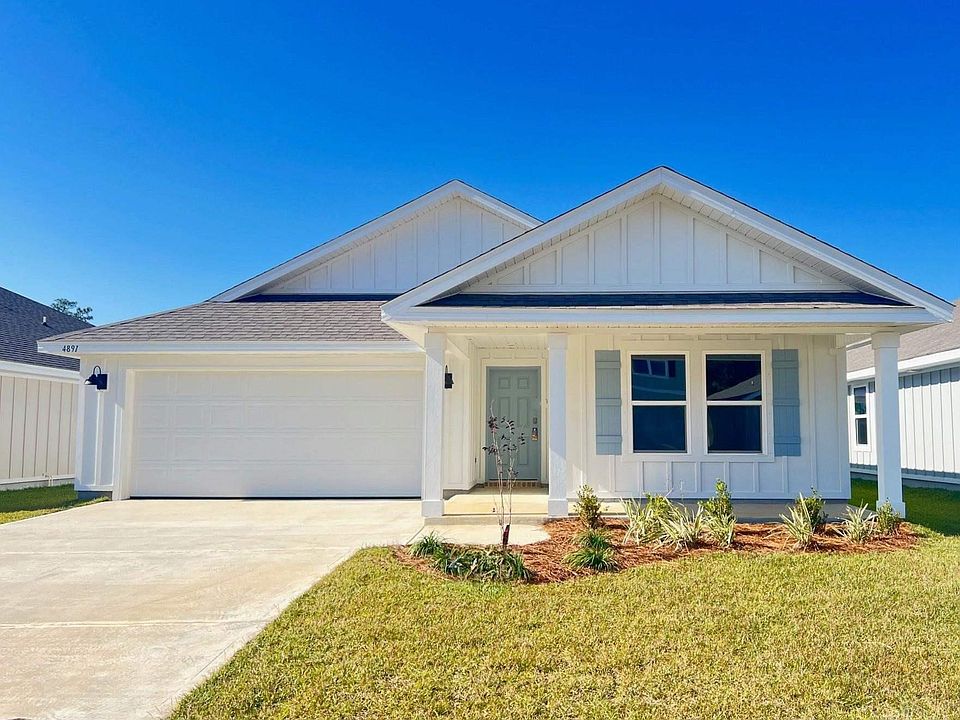 Experience the stunning Lakeside floor plan, a remarkable 5 bedroom, 3 bath home nestled in the desirable Lakes of Woodbine. As you approach, you'll discover two inviting guest bedrooms (4 and 5) conveniently situated near a shared bath. Step inside to an expansive open-concept kitchen, living, and dining area designed for modern living. The kitchen boasts an island, elegant quartz countertops, a spacious pantry, and sleek stainless-steel appliances. Beyond the dining area, a hallway leads you to guest bedrooms 2 and 3, plus an additional guest bath for added convenience. Retreat to Bedroom 1, your personal oasis featuring a luxurious ensuite bath and a generous walk-in closet. The home is also equipped with Smart Home Technology for your comfort and convenience. Enjoy resort-style amenities within this vibrant community, including a refreshing pool, a stylish clubhouse, scenic sidewalks, and a fitness center. Located centrally, you’ll have effortless access to shopping, dining, NAS Whiting Field, UWF campus, and the breathtaking Emerald Coast Beaches.