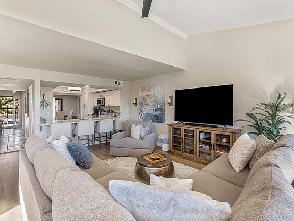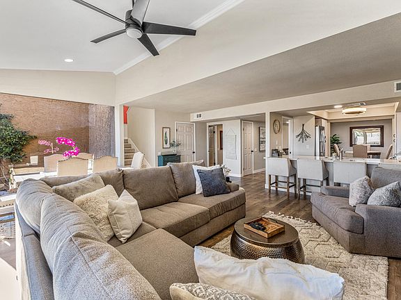 The patio overlooks the green area with mountain views, and the pool is just a few steps away. Floor to ceiling windows in the home's living areas bring the desert's natural allure inside to the heart of the home.