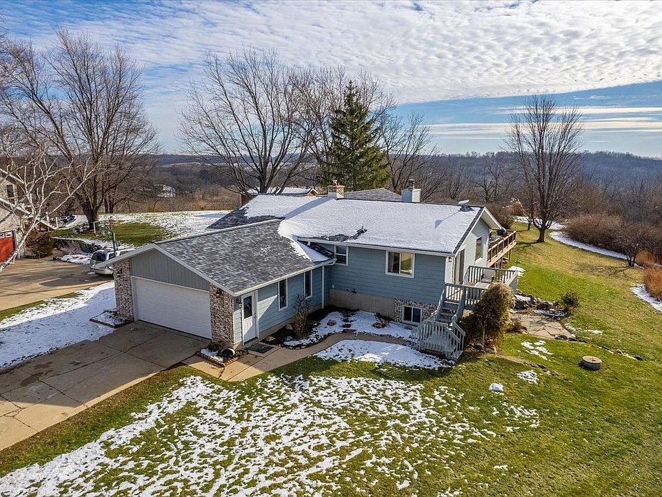 Don't miss this great raised ranch home on nearly 4 acres with trails, breathtaking views, great landscaping and gardens, on a cul-de-sac. The home is filled with windows allowing for beautiful views and tons of natural light to pour in. This house features a spacious deck, gorgeous primary suite w/ a wood burning fireplace, full bath, sunset views, and vaulted ceilings. There are a lot of updates including new roof, A/C, furnace, extended deck, new flooring in lower level, and main level common areas, among many other great updates. This property has so much to offer, come see for yourself!